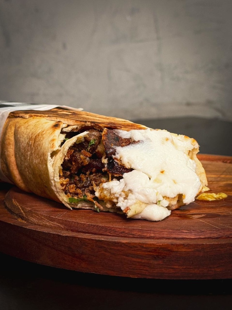 Feito no pão sírio, com fraldinha, bacon em cubos, salsinha picada com cebola, tomate, repolho, 3 palitos de batata frita no recheio, molho de mostarda temperada.