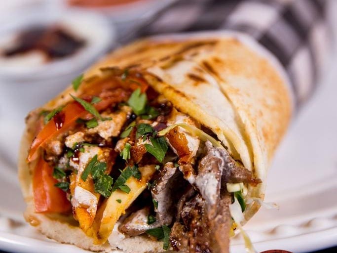 Feito no pão sírio, carne bovina e carne de frango, pasta de alho, salsinha picada com cebola, tomate, repolho, batata frita e molhos.