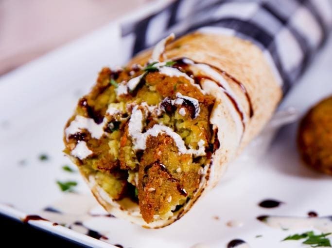 Feito no pão sírio, falafel , mussarela, pasta de alho, salsinha picada com cebola, tomate, repolho, batata frita e molhos.