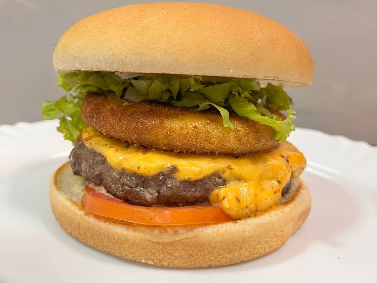 Pão brioche, hambúrguer 150 gr, cheddar, mussarela empanada , tomate, alface e cebola, fatias de bacon crocante e maionese da casa.