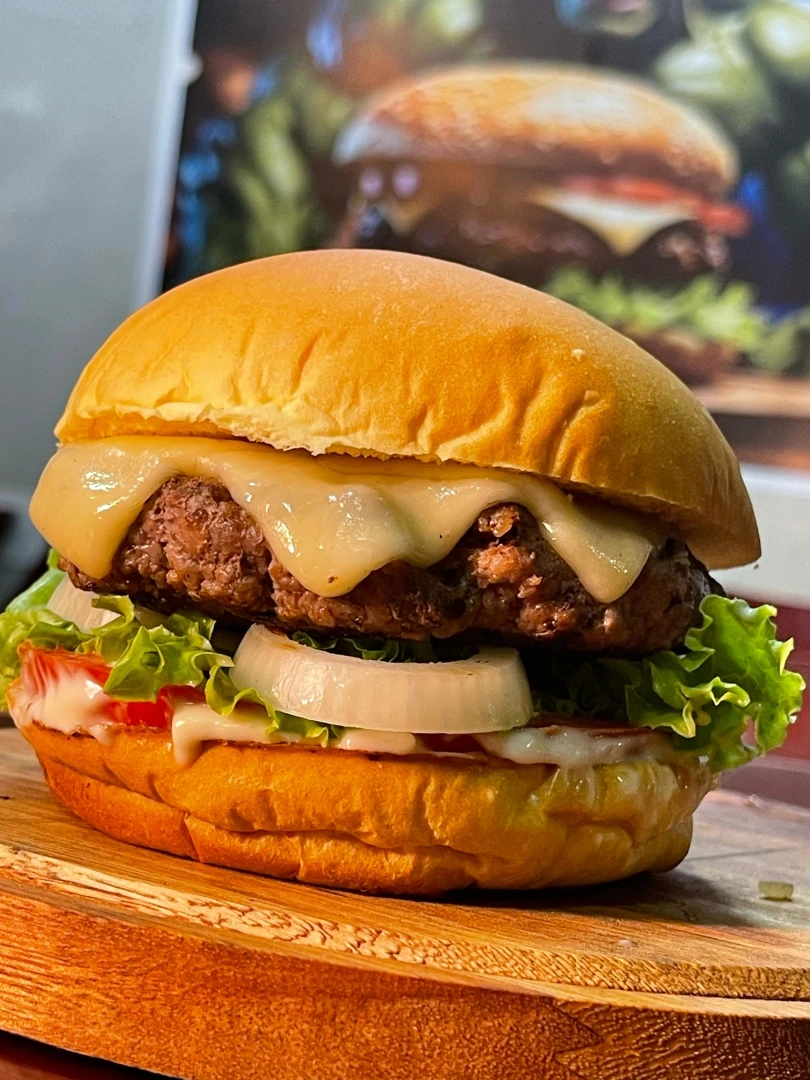 Pão brioche, Hambúrguer de 150gr, mussarela, alface, tomate , cebola e maionese da casa.